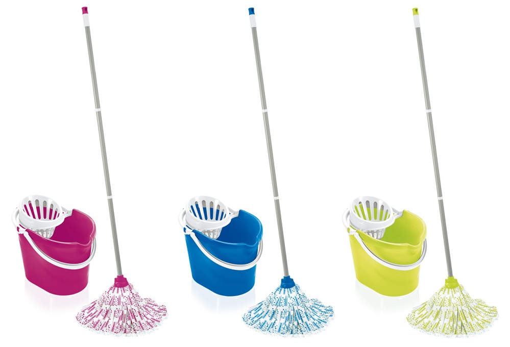 Πρακτικό "all-in-one" σετ σφουγγαρίσματος σε τρία χρώματα: ροζ, μπλε, και κίτρινο.