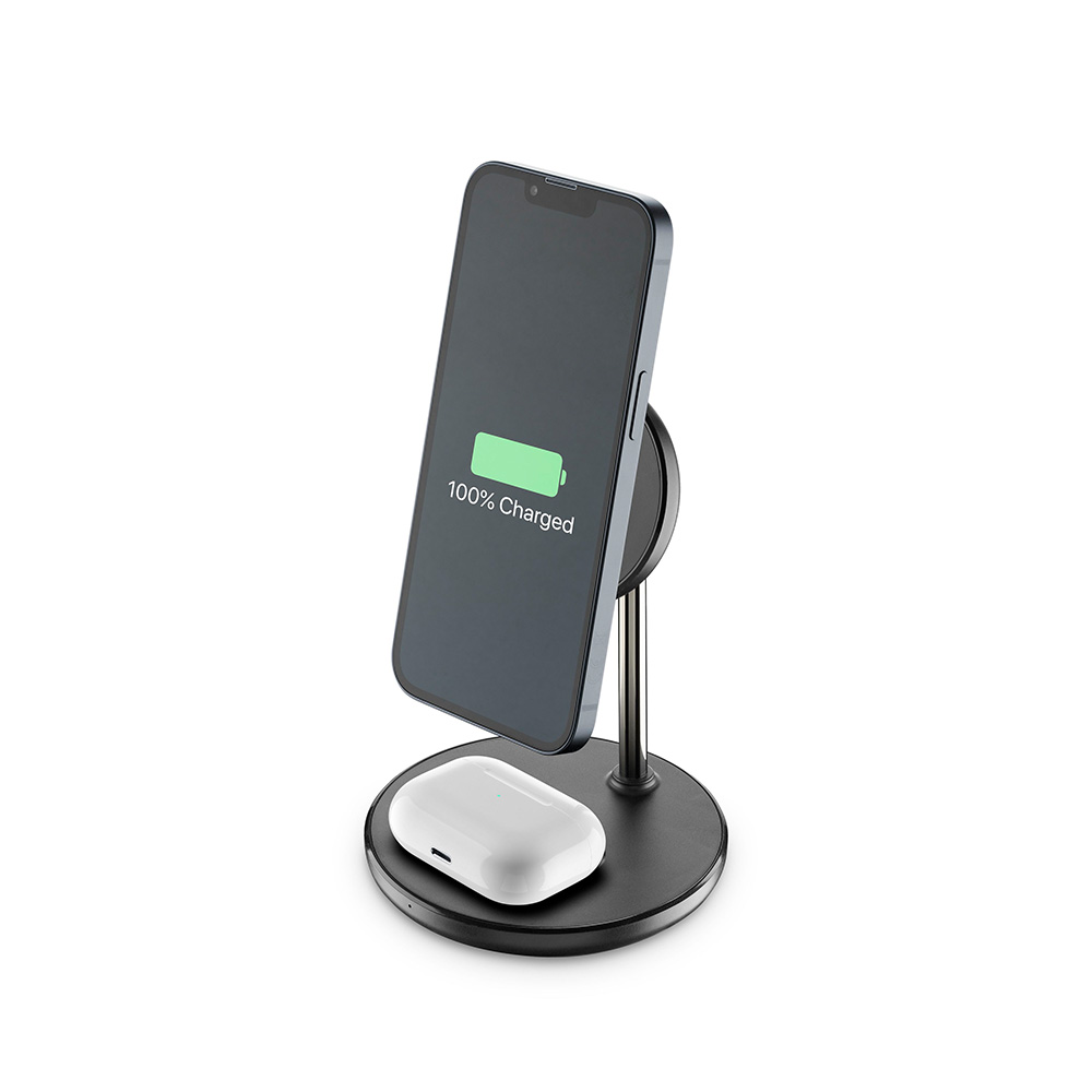 rnΤο MAG DUO WIRELESS CHARGER είναι η επιτραπέζια βάση με μαγνητική ασύρματη φόρτιση, ειδικά σχεδιασμένη για μοντέλα iPhone συμβατά με την τεχνολογία MagSafe.