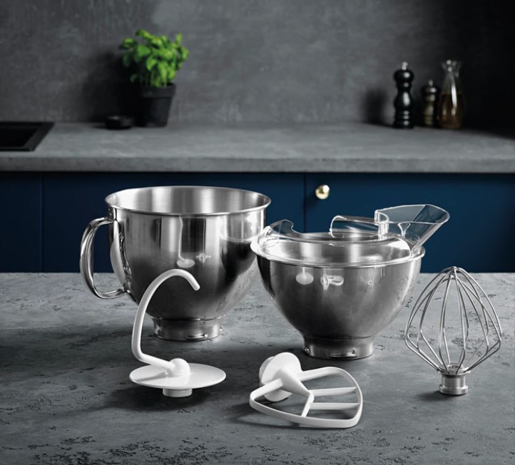 Περιλαμβάνονται: χτυπητήρι, αναδευτήρας, άγκιστρο ζυμώματος, προστατευτικό καπάκι και 2 μπολ.