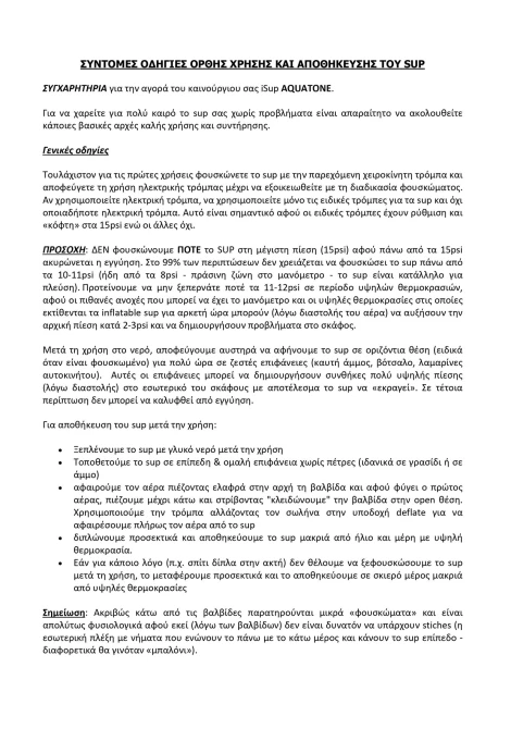 *Ανάλογα με το βάρος του χρήστη προτείνετε να φουσκώνει το SUP σε πίεση από 9-12 psi προσοχή σε καμία περίπτωση να μην υπερβείτε σε πίεση τα 15 psi!