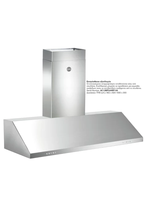 | Τοποθέτηση Απορροφητήρα | Εντοιχιζόμενος ή Επιτοίχιος σε σχέδιο ανάποδου "Τ" με αγορά της καμινάδας ως πρόσθετος εξοπλισμός |
