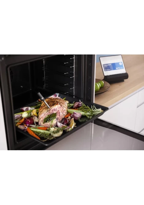 Το ασύρματο θερμόμετρο ψητού PerfectRoast σάς προσφέρει εύκολα και υγιεινά αποτελέσματα μαγειρέματος κάθε φορά. Οι τέσσερις αισθητήρες, μέσα στην εξαιρετικά λεπτή βελόνα που διαθέτει, μετρούν τη θερμοκρασία στο εσωτερικό του ψητού σας. Καθώς το θερμόμετρο αυτό είναι ασύρματο και συνδέεται με την εφαρμογή Home Connect μέσω Bluetooth, μπορείτε να παρακολουθείτε τη διαδικασία μαγειρέματος από το κινητό σας και από οπουδήποτε! Επιπλέον, μέσω της εφαρμογής θα λάβετε μια ενημέρωση όταν επιτευχθεί το επιθυμητό επίπεδο ψησίματος και ο φούρνος θα απενεργοποιηθεί αυτόματα, ώστε να βγάλετε το φαγητό σας από το φούρνο την κατάλληλη στιγμή. Παρακαλώ έχετε κατα νου πως πρέπει το κινητό σας να είναι εντός της εμβέλειας Bluetooth (έως και 50m) ώστε να λαμβάνει πληροφορίες για το μαγείρεμα. Τέλος, για να απενεργοποιηθεί αυτόματα ο φούρνος, πρέπει και εκείνος και η εφαρμογή να είναι συνδεδεμένα στο διαδίκτυο.