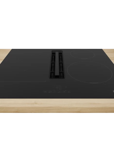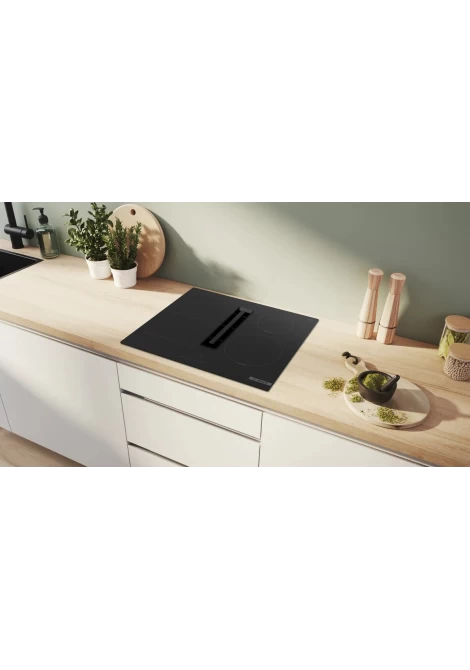 Η ενσωματωμένη μονάδα εξαερισμού συνδυάζει τα καλύτερα χαρακτηριστικά από τις επαγωγικές εστίες και τους απορροφητήρες μας. Τοποθετείται μέσα στη βάση εστιών, οπότε δεσμεύει τους υδρατμούς στην πηγή τους, εκεί δηλαδή που δημιουργούνται. Με αυτόν τον τρόπο, δεν χρειάζεστε ξεχωριστή μονάδα απορροφητήρα και επιπλέον έχετε περισσότερο διαθέσιμο χώρο για ντουλάπια ή πιο ανοιχτή θέα στην κομψή κουζίνα σας.