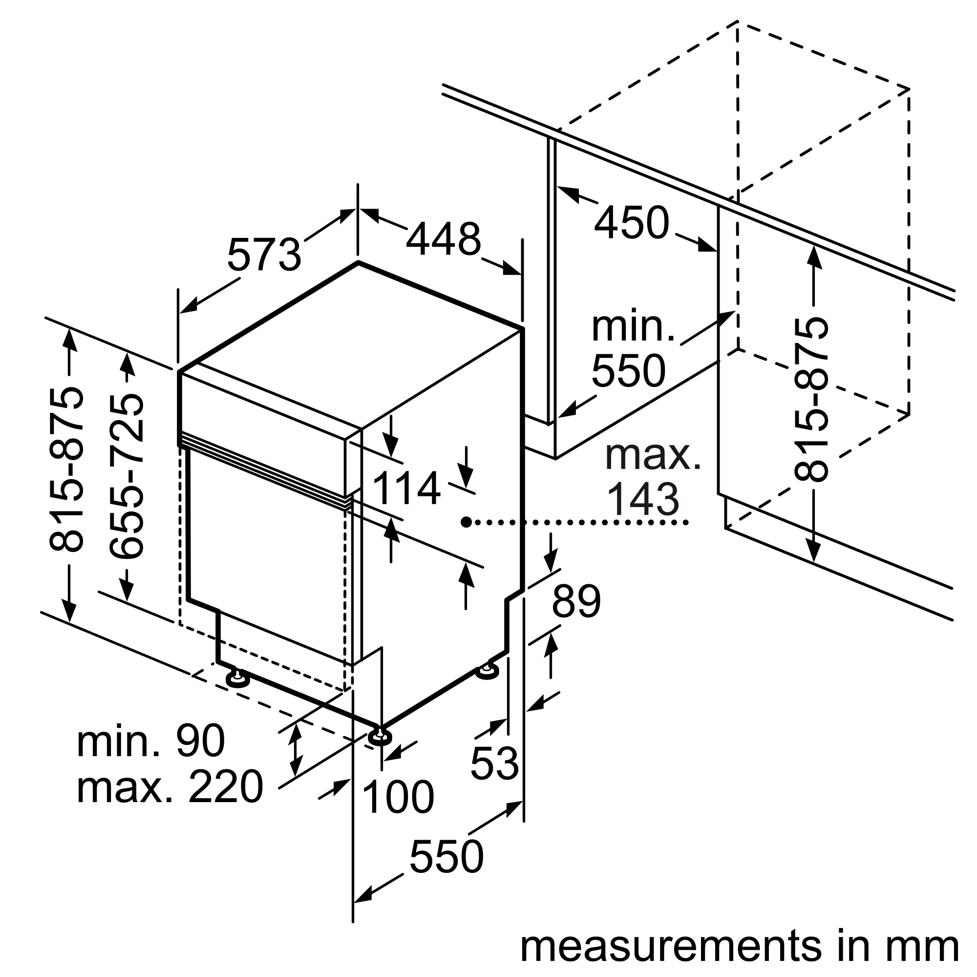 - Διαστάσεις εντοιχισμού (υ x π x β): 815-875 x 600 x 550 mm