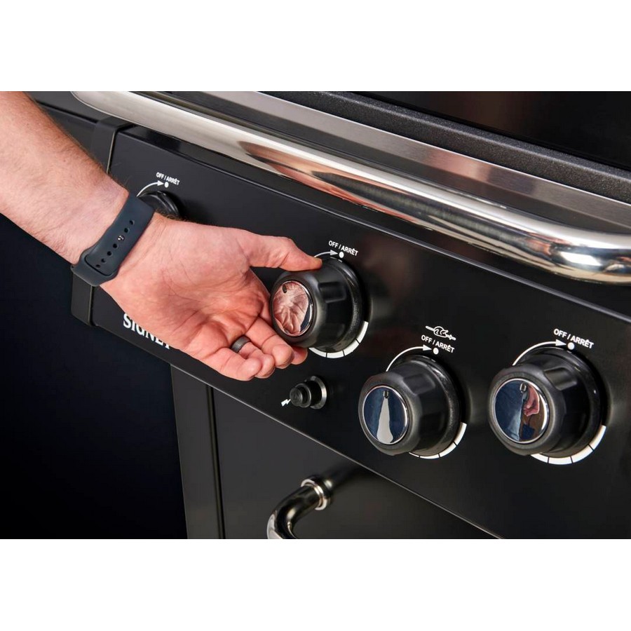 Η Signet 390 διαθέτει 2 μαντεμένιες σχάρες ψησίματος, ανοξείδωτο σύστημα εξάτμισης Flav-R-Wave, 3 ανοξείδωτους καυστήρες διπλής σωλήνωσης, θερμόμετρο ακριβείας, σύστημα ανάφλεξης και ειδική θέση στο εσωτερικό για τοποθέτηση της φιάλης, πλευρικό καυστήρα και ανοξείδωτο οπίσθιο καυστήρα με σετ σούβλας, μοτέρ σούβλας και καλώδιο παροχής 220V.