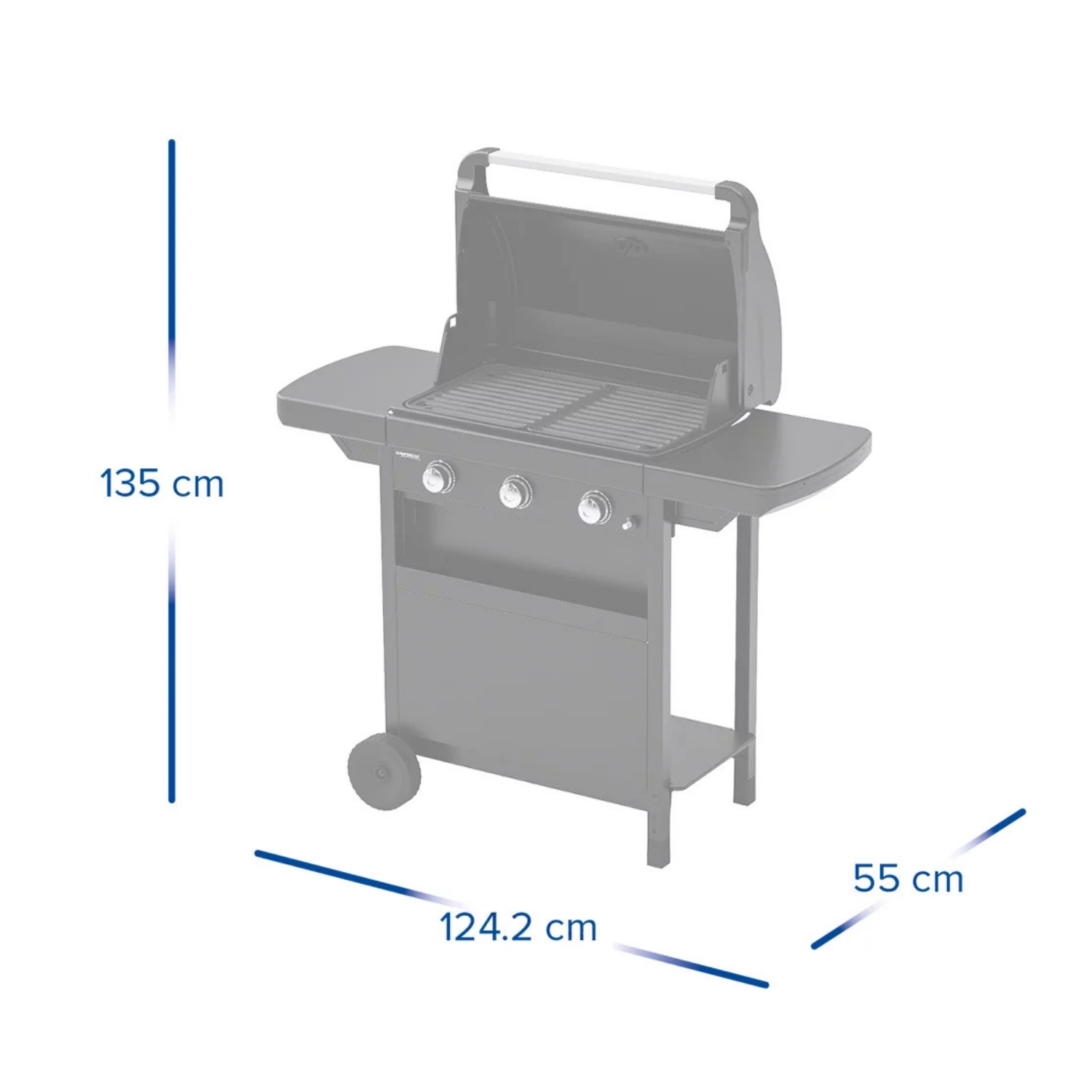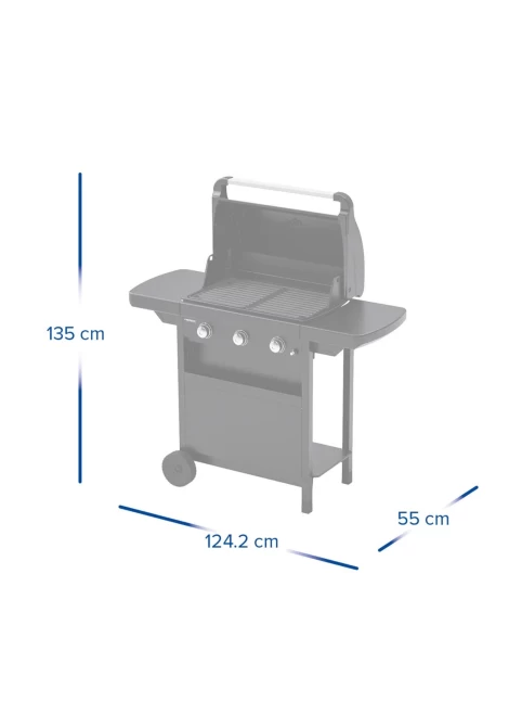 Η Compact 3 L, πάντα με την υπογραφή και την αξιοπιστία της Campingaz, διαθέτει τρεις χαλύβδινους καυστήρες ισχύος 7,5kW και σας επιτρέπει να χρησιμοποιείτε ανεξάρτητα τη μισή ή ολόκληρη επιφάνεια της σχάρας από επισμαλτωμένο ατσάλι.
