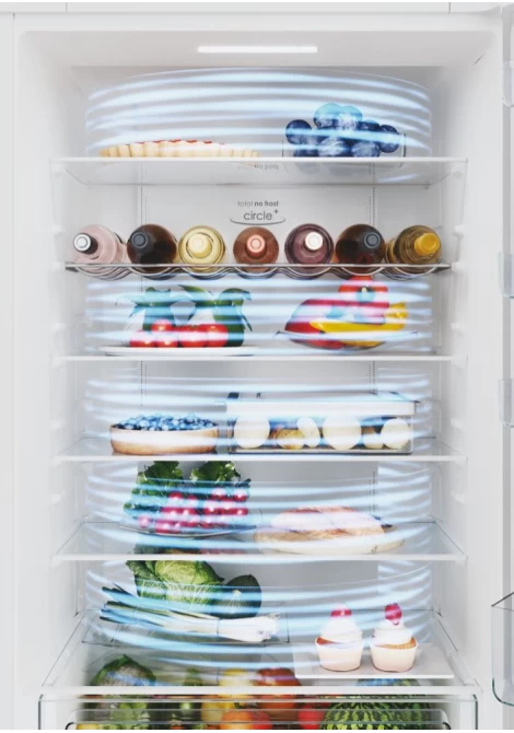Χάρη στην τεχνολογία Total No Frost Circle + , η σταθερή και ομοιογενής θερμοκρασία, καθώς και το επιθυμητό επίπεδο υγρασίας, είναι εγγυημένα σε κάθε ράφι και γωνία του ψυγείου σας. Η πλευρική ροή αέρα, διατηρεί το φαγητό σας φρέσκο για μεγαλύτερο χρονικό διάστημα, οπουδήποτε το αποθηκεύετε.