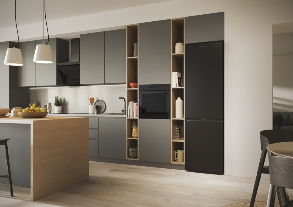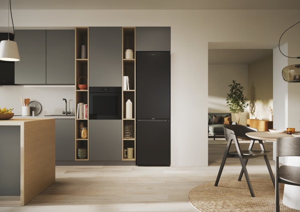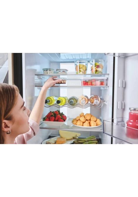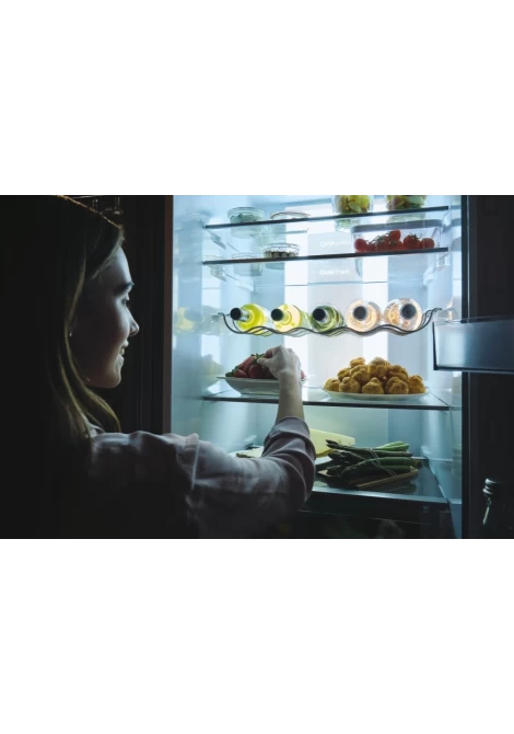 Το ψυγείο ενσωματώνεται τέλεια με το σχεδιασμό της κουζίνας σας: η λαβή και ο ιμάντας της πόρτας ταιριάζουν άψογα με τον πάγκο της κουζίνας, ενώ οι κρυφοί μεντεσέδες επιτρέπουν την ευέλικτη τοποθέτηση με άνοιγμα πόρτας 90°.