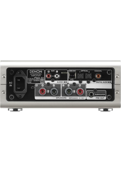Ο ενισχυτής PMA-60 παρέχει πραγματικό ήχο Denon, με εξαιρετική απόδοση παρά το μικρό του μέγεθος. Κι όλα αυτά με χρήση της τεχνολογίας Denon, αναπτυγμένης επί σειρά ετών, όπως την Advanced AL32 audio processing που χρησιμοποιείται για μετατροπή των ψηφιακών δεδομένων σε όμορφη μουσική. Με αναλογική και ψηφιακή συνδεσιμότητα, όπως Bluetooth®, το audio streaming από τον υπολογιστή σας ή την φορητή σας συσκευή είναι παιχνίδι. Κι αν ενδιαφέρεστε για υψηλής-ανάλυσης ήχο, ο ενισχυτής αυτός θα είναι η τέλεια επιλογή σας λόγω της εισόδου του USB-B. Με την εξοδό του στα 50W ανά κανάλι, καθίσταται κατάλληλος για μία ευρεία γκάμα τύπων ηχείων. Ο κομψός του σχεδιασμός του επιτρέπει να ταιριάζει σε περιορισμένους χώρους, ενώ μπορείτε ακόμα να τοποθετήσετε τον PMA-60 κάθετα, κι ο προσανατολισμός της OLED οθόνης θα ρυθμιστεί ανάλογα.