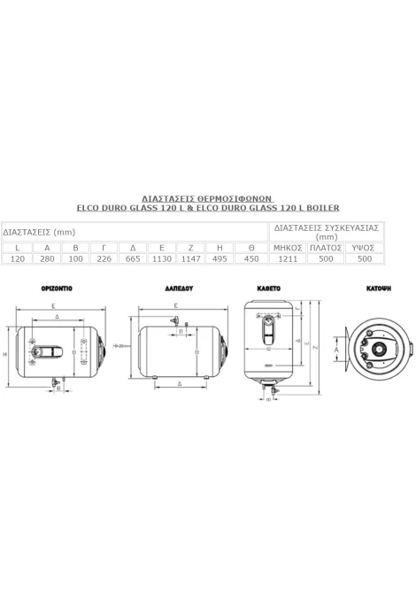 ELCO DURO GLASS 120L/4 BOILER Ηλεκτρικός Θερμοσίφωνας Οριζόντιος