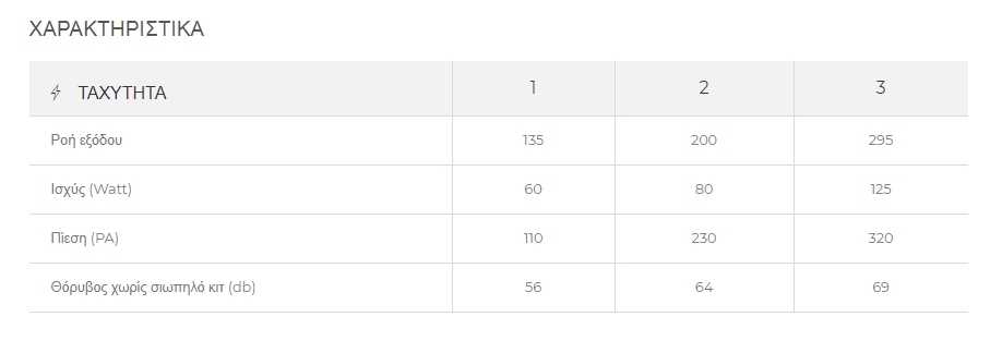Απορροφητική ισχύς στην μέγιστη ταχύτητα: 295 m³/h