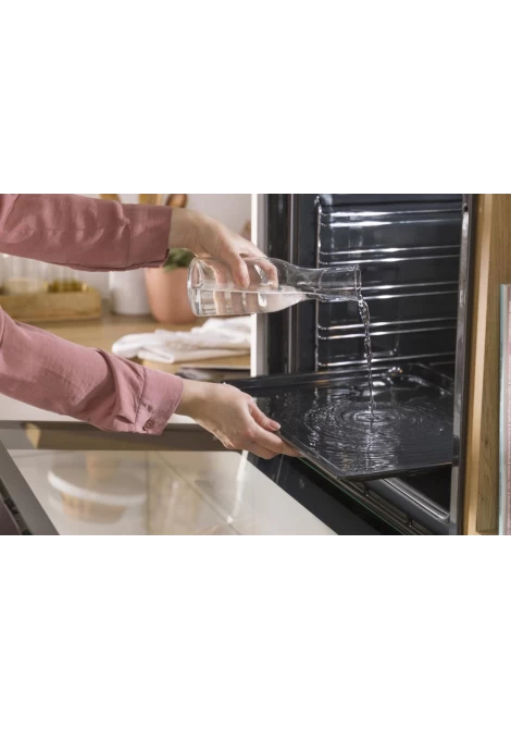 Προσθέτοντας νερό μέσα στο δοχείο νερού του πίνακα ελέγχου, θα απολαύσετε φαγητό τέλεια μαγειρεμένο στον ατμό και απόλυτα τραγανό. Όταν επιλέγετε ένα πρόγραμμα που διαθέτει δυνατότητα προσθήκης ατμού κατά το ψήσιμο, ο φούρνος σας ειδοποιεί στον κατάλληλο χρόνο. Ανάλογα με το μοντέλο του φούρνου, πρέπει είτε να πατήσετε το κεντρικό κουμπί είτε να αγγίξετε την αντίστοιχη λειτουργία στην οθόνη, για να ενεργοποιήσετε την προσθήκη ατμού.