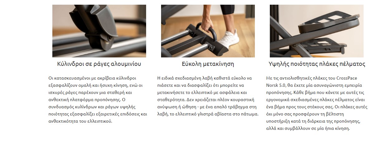 Το CrossPace 5.0 NorsK εντυπωσιάζει με τη σταθερότητά και τον εκπληκτικό, ξύλινο σχεδιασμό του. Το συγκεκριμένο ελλειπτικό δεν είναι μόνο ένας εξαιρετικά λειτουργικός εξοπλισμός άσκησης, αλλά και ένα πραγματικό μέρος της διακόσμησης που εμπλουτίζει τα δωμάτιά σας με μια ζεστασιά και κομψότητα που μόνο τα φυσικά υλικά μπορούν να προσφέρουν. Με τη ρυθμιζόμενη κλίση 3 επιπέδων, μπορείτε να προσαρμόσετε και να εντείνετε την προπόνηση σύμφωνα με τις επιθυμίες σας.