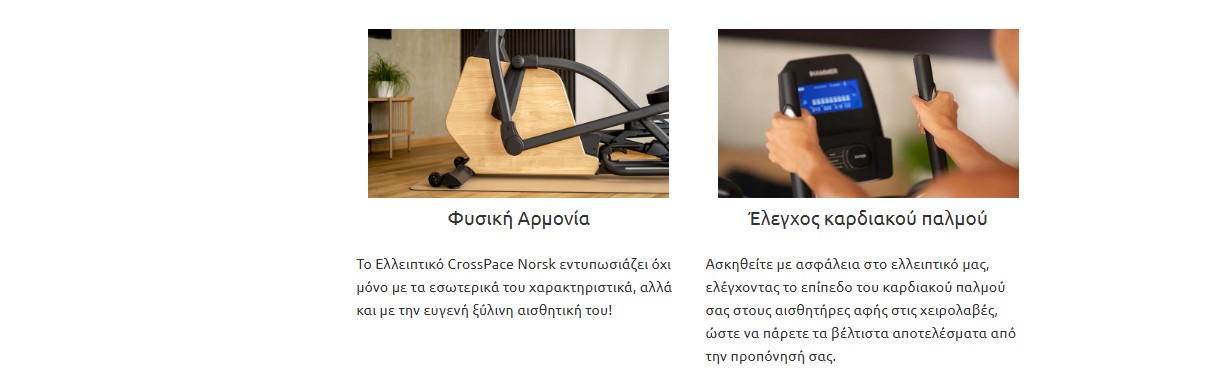 Με τον σχεδιασμό του σε μια κομψή εμφάνιση ξύλου, ο εξοπλισμός γυμναστικής της Σειράς NorsK ταιριάζει άψογα στο σαλόνι σας και σας παρακινεί να γυμνάζεστε τακτικά σε ένα ευχάριστο και οικείο περιβάλλον.