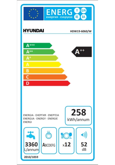 Το πλυντήριο πιάτων Hyundai HDW19-6060/W με χωρητικότητα 12 σερβίτσια, 6 προγράμματα και ενεργειακή κλάση Α++, αποτελεί την ιδανική λύση για το καθημερινό πλύσιμο των πιάτων σας. Με κατανάλωση ενέργειας μόλις 0.9 kWh ανά κύκλο πλύσης και 258kWh ανά έτος θα σας βοηθήσει στην εξοικονόμηση ενέργειας. Το πλυντήριο πιάτων για έναν κύκλο πλύσης χρησιμοποιεί 12 λίτρα νερού, που δίνει ετήσιο μέσο όρο 3.360 λίτρων.