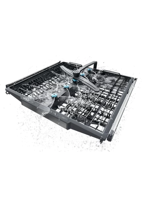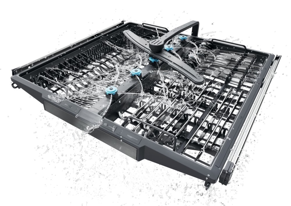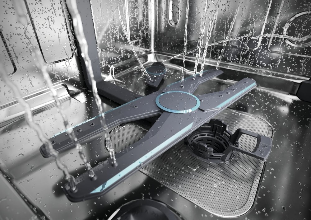 Ένας ολοκαίνουργιος, διεθνώς πατενταρισμένος, λειτουργικός σχεδιασμός στους βραχίονες ψεκασμού προσφέρει εξαιρετικό καθαρισμό σε σύντομο χρονικό διάστημα, ακόμη και με τα γρήγορα προγράμματα. Όλα αυτά είναι δυνατά χάρη στον ολοκαίνουργιο βραχίονα ψεκασμού σχήματος «H». Σχεδιασμένος να έχει διπλή δέσμη νερού, με μεγαλύτερη κάλυψη επιφάνειας και υψηλότερη πίεση ψεκασμού για να απομακρύνει αποτελεσματικά ακόμη και τις πιο επίμονες επικαθίσεις από τα σκεύη.