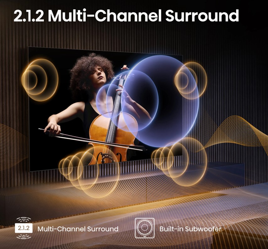 Εκλεπτυσμένος Surround ήχος 2.1.2 Multi-Channel Surround Άκου περισσότερα απ’ ό,τι περιμένεις με πολυκάναλο ήχο 2.1.2 Surround που γεμίζει τον χώρο με βάθος, καθαρότητα και μέγεθος. Χωρίς επιπλέον εξοπλισμό, ανακάλυψε λεπτομέρειες που μέχρι τώρα δεν μπορούσες να τις αντιληφθείς |