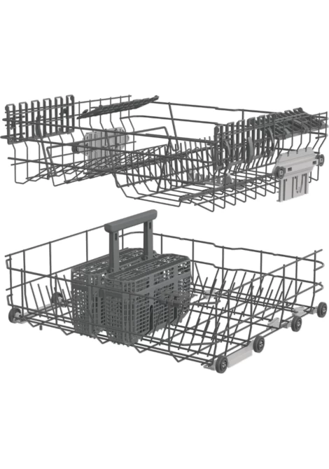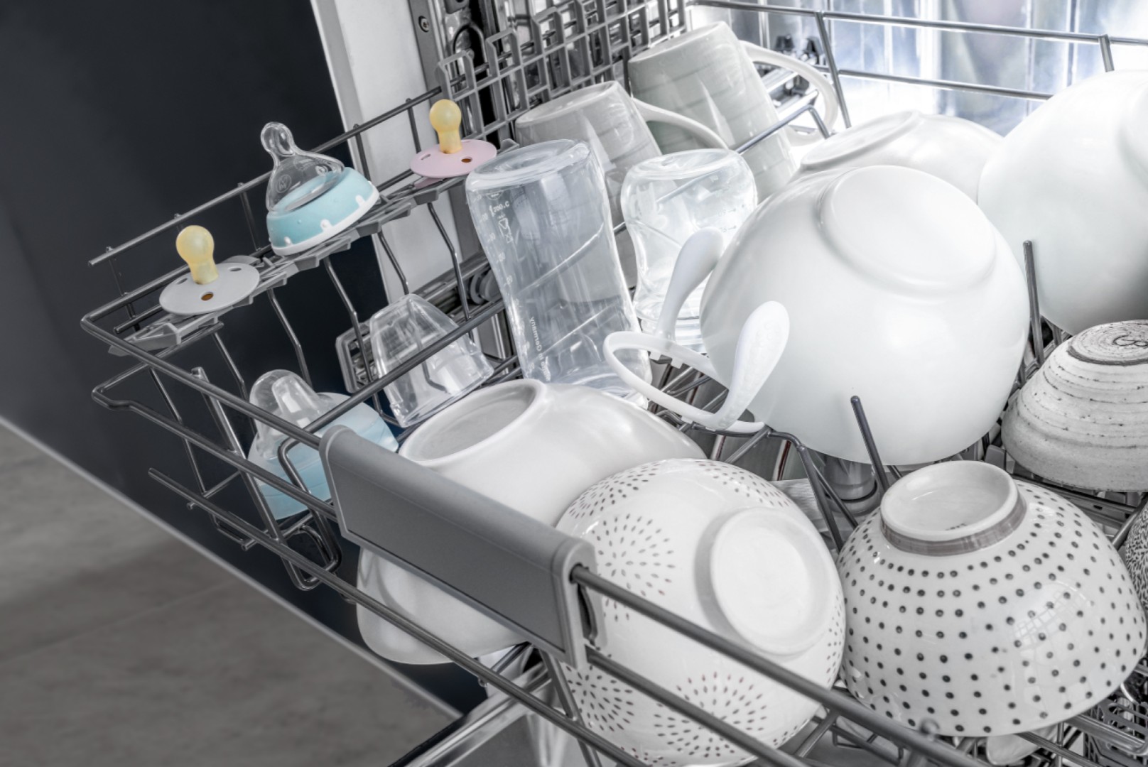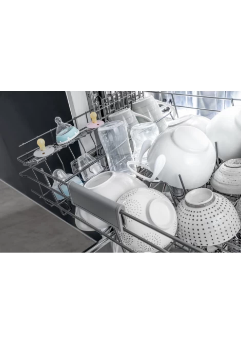 Ρυθμιζόμενα καλάθια σε τρία επίπεδα και αναδιπλούμενες βάσεις πιάτων που προσαρμόζονται εύκολα σε κάθε φορτίο – ακόμα και για μεγάλα σκεύη.