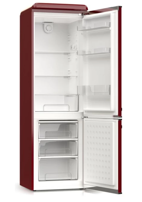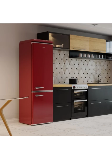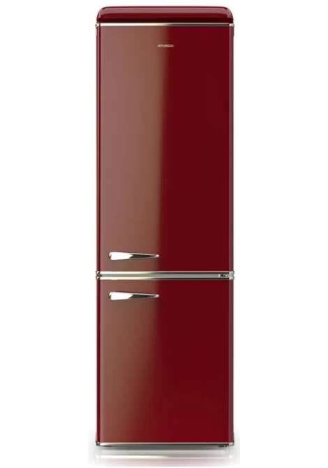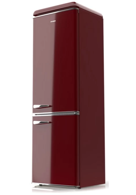 Ψυγειοκαταψύκτης Hyundai HCVG23-310R με ρετρό σχεδιασμό σε κόκκινο χρώμα, χωρητικότητα τροφίμων που φθάνει τα 300 λίτρα και υψηλή απόδοση E για εξοικονόμηση ενέργειας.