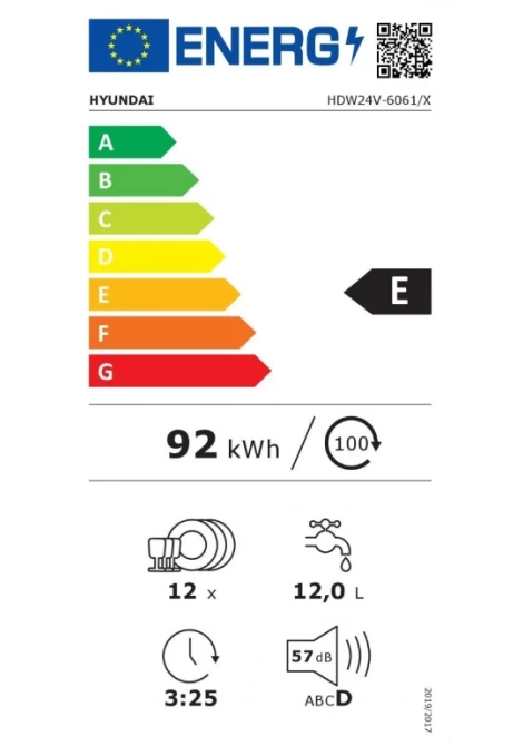 Το πλυντήριο πιάτων Hyundai HDW24V-6061/W με χωρητικότητα 12 σερβίτσια, 4 προγράμματα και ενεργειακή κλάση E, αποτελεί την ιδανική λύση για το αποτελεσματικό πλύσιμο των πιάτων σας. Με κατανάλωση ενέργειας 258kWh ανά έτος θα σας βοηθήσει επίσης και στην εξοικονόμηση ενέργειας.