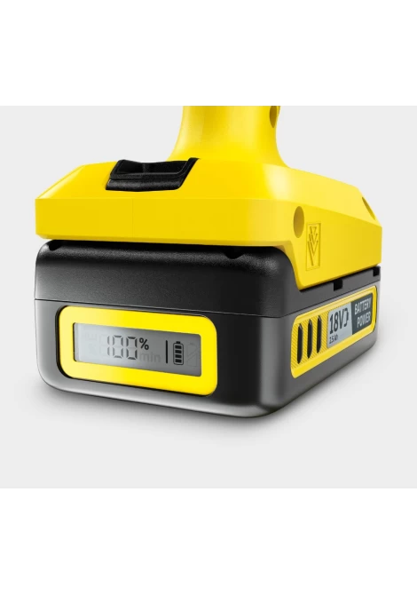 Τεχνολογία πραγματικού χρόνου (Real Time) για τη λειτουργία οθόνης LCD στην μπαταρία με τις ακόλουθες ενδείξεις: υπολειπόμενος χρόνος λειτουργίας, υπολειπόμενος χρόνος φόρτισης και χωρητικότητα μπαταρίας. Μεγάλη και ισχυρή χάρη στα κύτταρα ιόντων λιθίου. Συμβατό με όλες τις συσκευές που ανήκουν στην πλατφόρμα μπαταριών 18 V Battery Power της Kärcher.