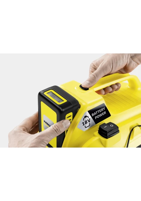 Επιτρέπει την πραγματοποίηση εργασιών χωρίς να χρειάζεται να χρησιμοποιηθεί πρίζα και, κατά συνέπεια, εξασφαλίζει μέγιστη ελευθερία κινήσεων. Τεχνολογία πραγματικού χρόνου (Real Time) για τη λειτουργία οθόνης LCD στην μπαταρία με τις ακόλουθες ενδείξεις: υπολειπόμενος χρόνος λειτουργίας, υπολειπόμενος χρόνος φόρτισης και χωρητικότητα μπαταρίας. Συμβατό με όλες τις συσκευές που ανήκουν στην πλατφόρμα μπαταριών 18 V Battery Power της Kärcher.