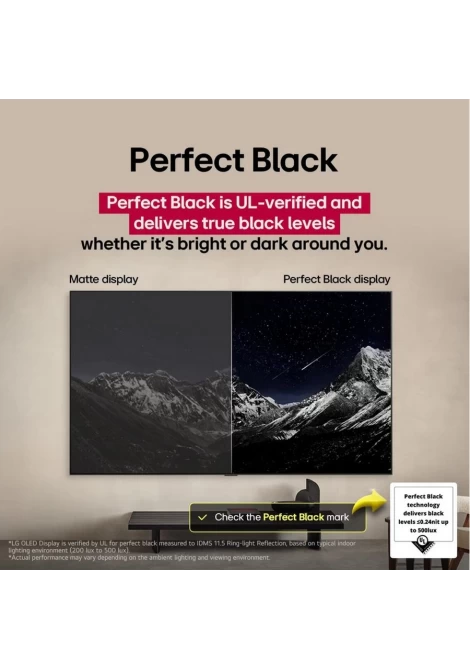 Το Perfect Black έχει πιστοποίηση UL και αποδίδει επίπεδα πραγματικού μαύρου για να ενισχύει την εκλαμβανόμενη φωτεινότητα και αντίθεση. Επίσης, έχει κερδίσει την πιστοποίηση UL eyesafe για μια πιο άνετη εμπειρία παρακολούθησης, μειώνοντας τις εκπομπές μπλε φωτός.