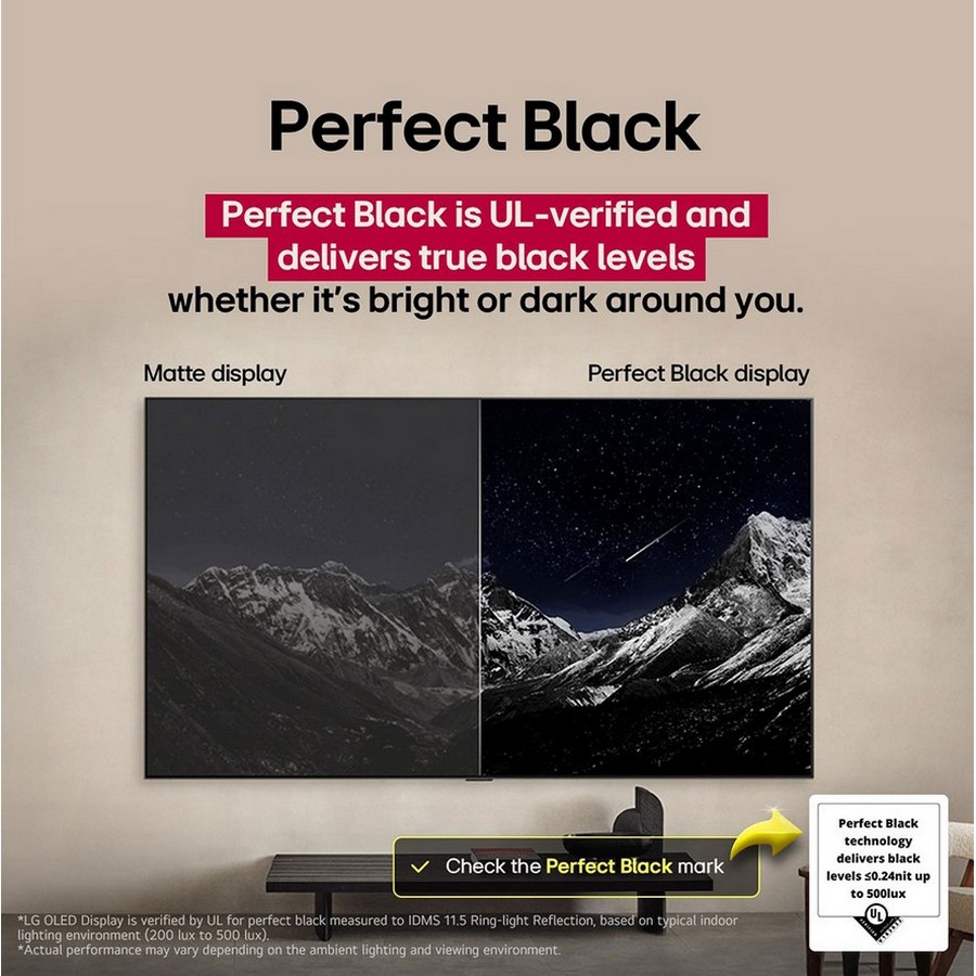 Το Perfect Black έχει πιστοποίηση UL και αποδίδει επίπεδα πραγματικού μαύρου για να ενισχύει την εκλαμβανόμενη φωτεινότητα και αντίθεση. Επίσης, έχει κερδίσει την πιστοποίηση UL eyesafe για μια πιο άνετη εμπειρία παρακολούθησης, μειώνοντας τις εκπομπές μπλε φωτός.