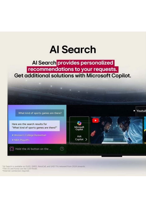 Ζητήστε από την τηλεόρασή σας οτιδήποτε. Η ενσωματωμένη AI αναγνωρίζει τη φωνή σας και παρέχει εξατομικευμένες προτάσεις. Μπορείτε να λάβετε επίσης επιπλέον αποτελέσματα και λύσεις με το Microsoft Copilot.