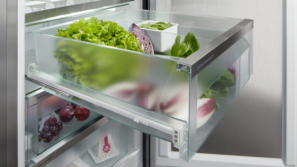 Τραγανή σαλάτα ή φράουλες: Τα πιο ευαίσθητα τρόφιμα αξίζουν μια ιδιαίτερη θέση, για να παραμένουν φρέσκα για μεγαλύτερο διάστημα: τα συρτάρια BioFresh. Στη "Φρουτολεκάνη Fruit & Vegetable" η θερμοκρασία είναι σχεδόν 0 °C. Σε συνδυασμό με την υγρασία αέρα που επικρατεί εκεί μόνιμα, χάρη στο στεγανό κλείσιμο, τα μη συσκευασμένα φρούτα και λαχανικά αισθάνονται ιδιαίτερα καλά. Δεν χρειάζεται να κάνετε καμία ρύθμιση.