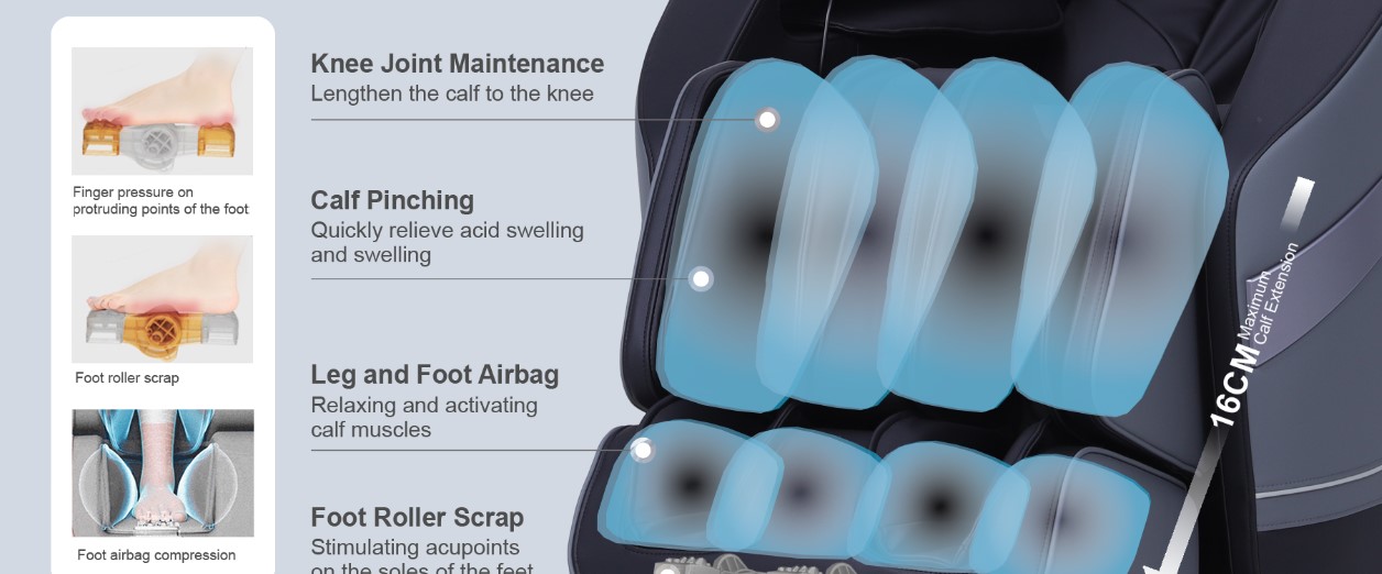 Αποβάλλετε Γρήγορα την ΚόπωσηΤο μασάζ ποδιών περιλαμβάνει μασάζ αερόσακων στις κνήμες, μασάζ "δακτύλων" στις άκρες των πελμάτων και μασάζ κυλίνδρων στην μέση των πελμάτων.