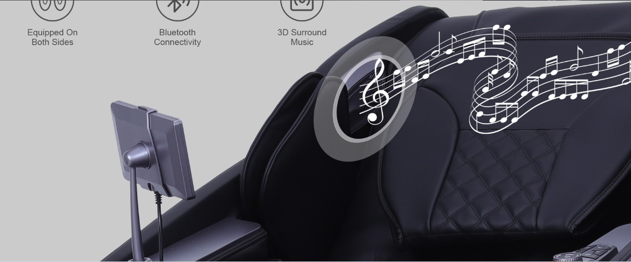Κατόπιν ενεργοποίησης της λειτουργίας bluetooth της πολυθρόνας, η συσκευή πηγής ήχου (π.χ. κινητό τηλέφωνο ή διαδικτυακό tablet) μπορεί να συνδεθεί με τη μονάδα bluetooth της πολυθρόνας και η μουσική που αναπαράγεται από την συσκευή πηγής ήχου μπορεί να μεταδοθεί ασύρματα στο ηχοσύστημα της πολυθρόνας μασάζ για αναπαραγωγή.