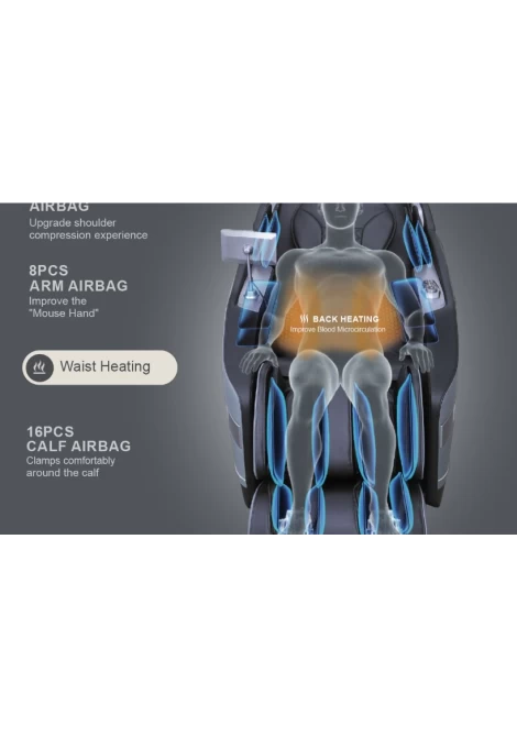 Περιλαμβάνει επίσης 15 αυτόματα προγράμματα, 5 διαφορετικά είδη μασάζ και κυρίως μηχανισμό διπλής κεφαλής κατά μήκος της πλάτης, σε συνδυασμό με αερόσακους για τα άκρα, έτσι ώστε να αποτελεί την αποτελεσματικότερη λύση στο καθημερινό σας στρες και να σας βοηθά να βρίσκετε τον καλύτερο εαυτό σας σε κάθε μέρα!