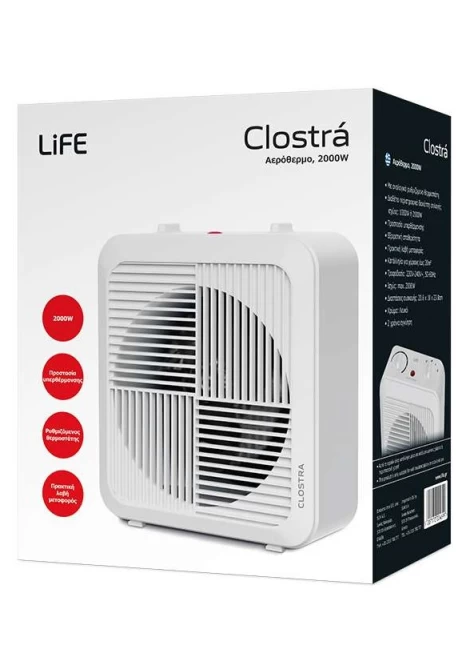 Επιπλέον, διαθέτει λειτουργία προστασίας από υπερθέρμανση, παρέχει εξαιρετική σταθερότητα χάρη στις συμπαγείς του διαστάσεις, ενώ η πρακτική του λαβή μεταφοράς διευκολύνει τη μεταφορά του και καθιστά το LIFE Clostra την ιδανική λύση για θέρμανση σε κάθε χώρο διαστάσεων έως 20τ.μ.