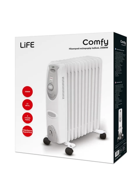 Ζεστάνετε αποτελεσματικά τον χώρο σας με το ηλεκτρικό καλοριφέρ λαδιού LIFE COMFY. Με 11 φέτες μεγάλου μεγέθους σας προσφέρει άμεσα αποτελεσματική και ομοιόμορφη θέρμανση. Διαθέτει δύο διακόπτες ρύθμισης ισχύος για να επιλέξετε ανάμεσα σε τρία επίπεδα 1000W / 1500W / 2500W, καθώς και ρυθμιζόμενο θερμοστάτη ώστε να διατηρεί το επιθυμητό επίπεδο θερμοκρασίας στο χώρο.