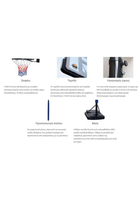 Η Life Sport S021 Μπασκέτα με Βάση έχει ρυθμιζόμενο ύψος. Αποτελείται από ένα υψηλής πυκνότητας ακρυλικό ταμπλό 110 x 75 εκατοστά με προστασία από πολυαιθυλένιο και έχει ένα σταθερό στεφάνι το οποίο είναι κατάλληλο για μπάλες #7. Ο εντυπωσιακός γκρι χαλύβδινος στύλος μπορεί να προσαρμοστεί από 203 έως 305 εκατοστά. Διαθέτει μία βάση 110x72x20 εκατοστά που γεμίζει με νερό 125 κιλών και έχει ενσωματωμένους τροχούς ώστε να είναι εύκολο να μετακινηθεί.