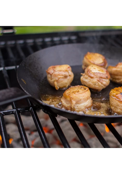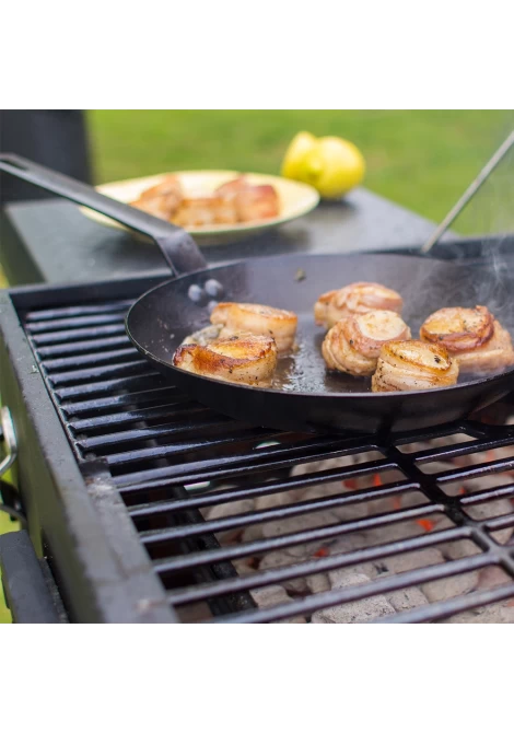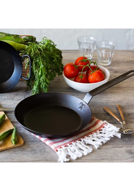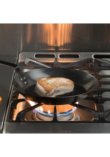 Το Τηγάνι Seasoned Carbon Steel είναι φτιαγμένο από άριστης ποιότητας ανθρακούχο χάλυβα (ατσάλι) , ανθεκτικής κατασκευής με ατσάλινη λαβή που έχει καρφωθεί για να εξασφαλίσει την άκαμπτη σύνδεση με το σώμα του τηγανιού, ώστε να αντέχει ακόμα και στις πιο απαιτητικές επαγγελματικές κουζίνες. Με ιδανικές διαστάσεις ώστε να εξυπηρετεί τις ανάγκες των απαιτητικών chef αλλά και της νοικοκυράς. Όπως και τα μαντεμένια σκεύη μας, έχει 100% φυσική επικάλυψη με φυτικό λάδι σόγιας, που βελτιώνεται με την χρήση, ενώ έχει μαύρο χρώμα ως αποτέλεσμα του Logic Seasoned φινιρίσματος. Ιδιαίτερα αποτελεσματικό και ευέλικτο, χρησιμοποιήσετε άφοβα στην επιφάνεια του μεταλλικά εργαλεία κουζίνας όπως μαχαίρια, πιρούνια ή σπάτουλες. Κατάλληλο για χρήση σε κάθε είδους εστία ή φούρνο, στο μπάρμπεκιου ή απευθείας πάνω στη φωτιά, εξαιρουμένου του φούρνου μικροκυμάτων. Το καθάρισμα και η συντήρηση του είναι ίδια με των μαντεμένιων σκευών μαγειρικής Lodge. Αν το συντηρήσετε σωστά θα το έχετε για μια ζωή! Σωστό, ομοιόμορφο και υγιεινό μαγείρεμα, όπως με το μαντέμι με μόνη διαφορά ότι τα ατσαλένια σκεύη μαγειρικής είναι λεπτότερα και συνεπώς ελαφρύτερα. Επίσης, η λεπτότερη επιφάνεια μαγειρέματος των ατσαλένιων μαγειρικών σκευών ζεσταίνεται πιο γρήγορα όταν εφαρμόζεται στην πηγή θερμότητας και κρυώνει πιο γρήγορα όταν αφαιρεθεί από την πηγή θερμότητας.