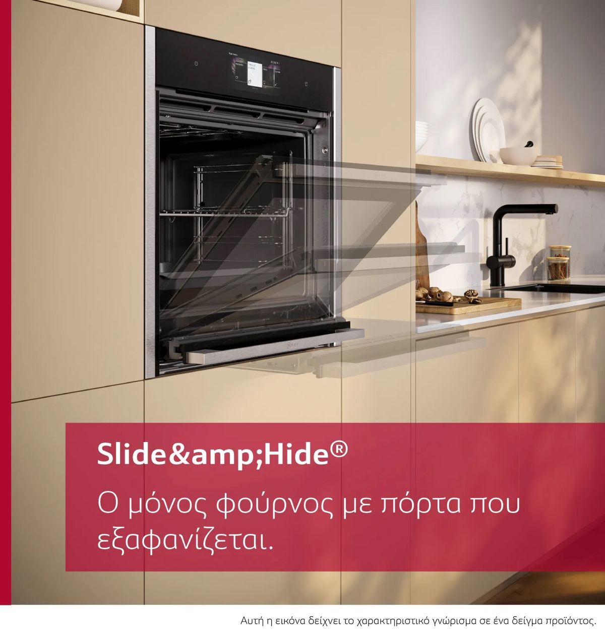 Δεν είναι κάποιο μαγικό, είναι απλά το Slide & Hide®, η πόρτα που εξαφανίζεται κάτω από τον φούρνο.Η πόρτα Slide & Hide® εξαφανίζεται απαλά κάτω από τον φούρνο, για να μπορείτε να αλείψετε τα ψητά σας και να δοκιμάσετε εύκολα τα φαγητά σας.Με αυτόν τον τρόπο, μπορείτε να ελέγξετε πιο εύκολα το λαχταριστό γεύμα που ετοιμάζετε.Ακόμα και όταν η πόρτα ανασύρεται κάτω από το φούρνο, είναι εξίσου εντυπωσιακό.Απλώς τραβήξτε προς τα πάνω την περιστρεφόμενη λαβή, σε οποιαδήποτε θέση, για να επαναφέρετε την πόρτα στη θέση της.