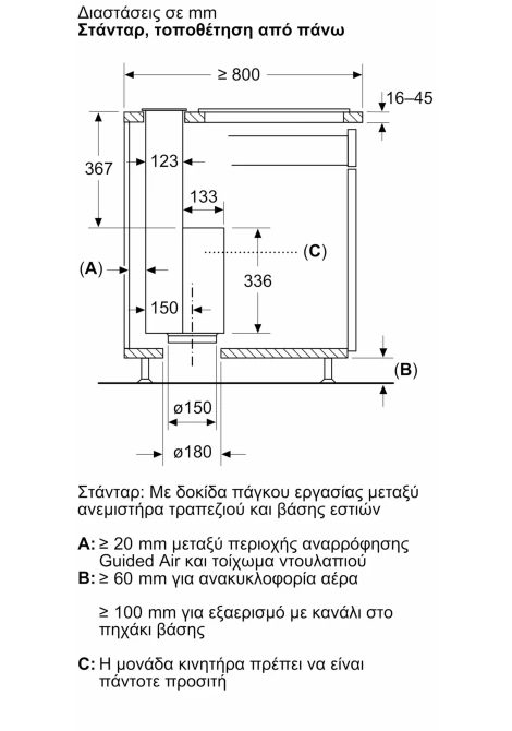 Τεχνολογία Guided Air: Τεχνολογία καθοδήγησης αέρα για πανίσχυρη και ομοιόμορφη απορρόφηση των υδρατμών και όλων των οσμών κατά το μαγείρεμα, από ολόκληρη την επιφάνεια της εστίας.