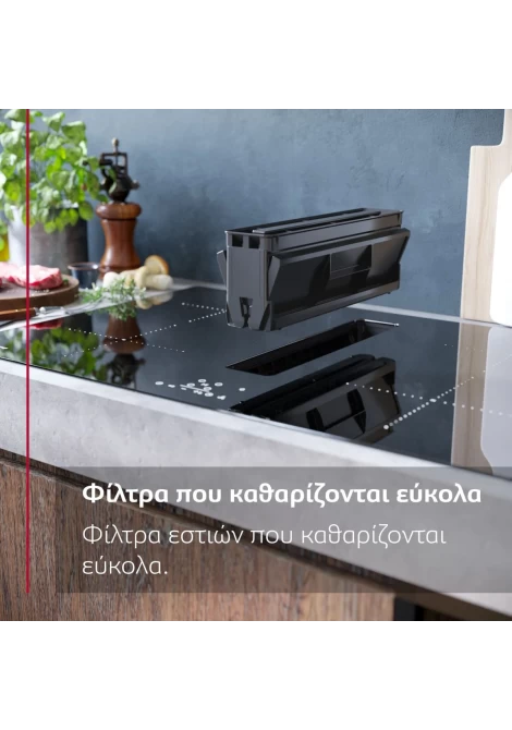 Υψηλή απόδοση, εύκολη συντήρηση. Με βάση αυτά τα χαρακτηριστικά, σχεδιάσαμε την εστία με ενσωματωμένο απορροφητήρα. Για να καθαρίσετε το μεταλλικό φίλτρο από τα λίπη, απλώς πιάστε το με το ένα χέρι και τραβήξτε το να βγει. Στη συνέχεια, τοποθετήστε το στο πλυντήριο πιάτων για εύκολο καθάρισμα.