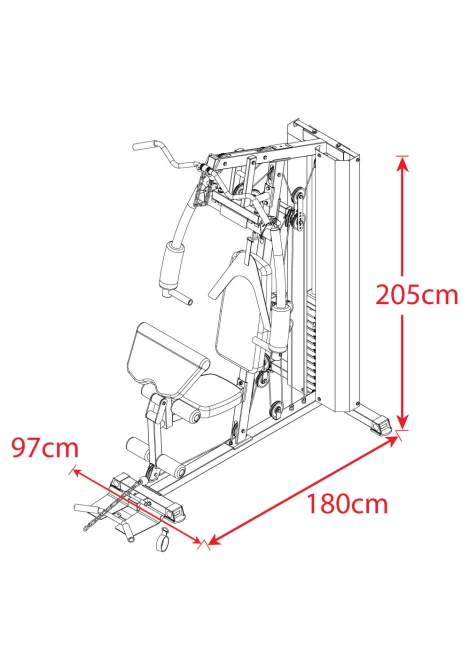 Κατασκευασμένο από ανθεκτικό χάλυβα 70x50x1.5mm, τροχαλίες με κλειστού τύπου ρουλεμάν, συρματόσχοινα υψηλής αντοχής και ταπετσαρίες από ποιοτική δερματίνη PU, ανθεκτικές στον ιδρώτα και στην φθορά. Περιλαμβάνεται μεταλλικό κάλυμμα των βαρών για ασφάλεια και μείωση του θορύβου, καθώς και ειδικό ασκησιολόγιο.