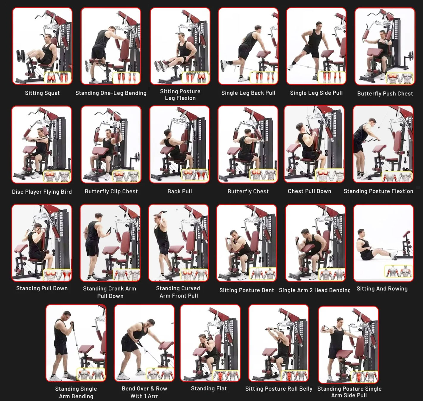 | Ασκήσεις | Πιέσεις Στήθους, Κωπηλατική στο έδαφος ή καθιστή, Pec Deck, Κάμψεις Δικεφάλων και Πιέσεις Τρικεφάλων, Έλξεις, Εκτάσεις-Κάμψεις ποδιών, Προσαγωγοί-Απαγωγοί-Γλουτιαίοι με ιμάντα, Ροκανίσματα Κοιλιακών κ.ά. |