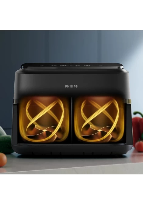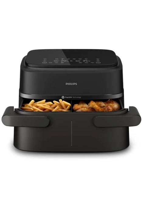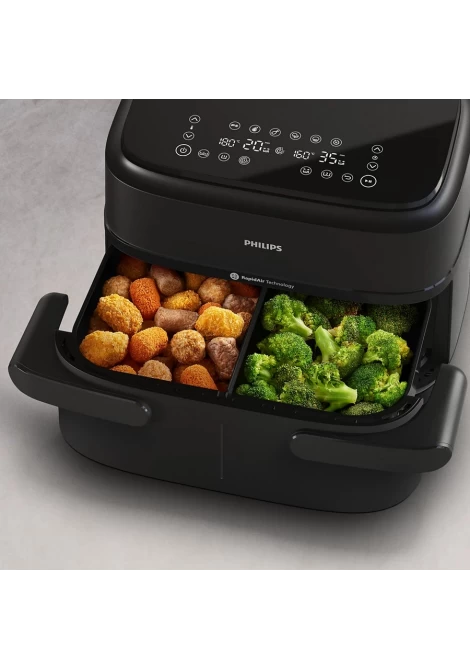 Το πιο μικρό μας Airfryer με διπλό καλάθι. Δύο γεύματα με το διαχωριστικό ή ένα χωρίς αυτό και όλα έτοιμα.