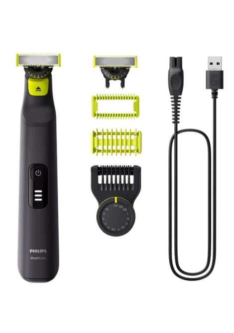 Το Philips OneBlade Pro για Πρόσωπο + Σώμα τριμάρει, διαμορφώνει και ξυρίζει κάθε μήκους τρίχα. Περιλαμβάνει μια λεπίδα για το πρόσωπο και μία επιπλέον με ειδικό προστατευτικό κάλυμμα για το σώμα. Ξέχασε τα πολλαπλά εργαλεία: το OneBlade τα κάνει όλα.