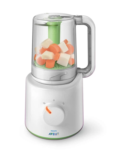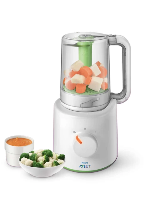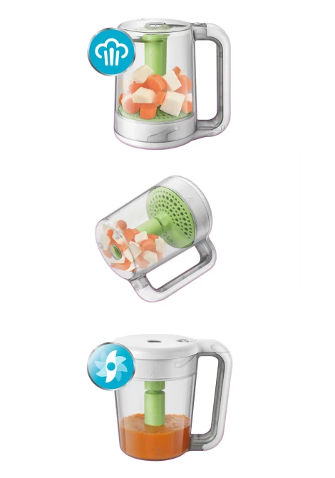 Μπορείτε να προετοιμάσετε εύκολα θρεπτική σπιτική βρεφική τροφή με τον παρασκευαστή υγιεινής βρεφικής τροφής 2-σε-1 της Philips Avent. Πρώτα μαγειρέψτε στον ατμό φρούτα, λαχανικά, ψάρι ή κρέας και στη συνέχεια απλά ανασηκώστε και αναποδογυρίστε την κανάτα για ανάμειξη, χωρίς να χρειάζεται να μεταφέρετε το φαγητό σε άλλο σκεύος!
