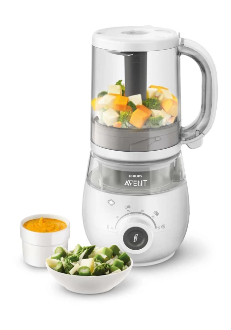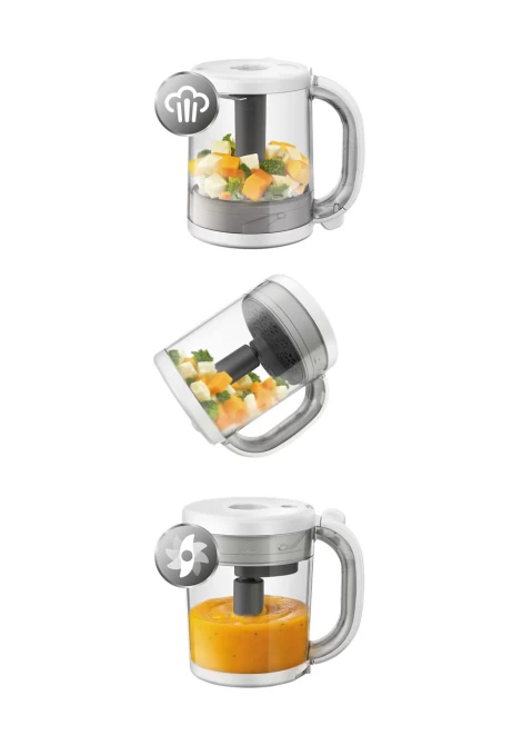 Παρασκευαστής υγιεινής βρεφικής τροφής 4 σε 1 που λειτουργεί σαν ατμομάγειρας και μπλέντερ και παράλληλα, διαθέτει λειτουργία απόψυξης και αναθέρμανσης φαγητού. Μαγειρέψτε έως και 4 γεύματα κάθε φορά με την κανάτα χωρητικότητας 1000ml. Διαθέτει ηχητική ειδοποίηση ολοκλήρωσης του μαγειρέματος στον ατμό, απόψυξης και αναθέρμανσης. Περιέχει σκεύος αποθήκευσης 120 ml, σπάτουλα και βιβλίο συνταγών.