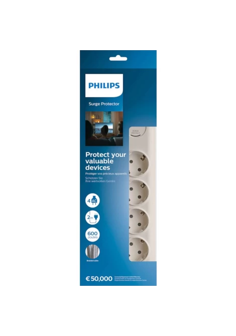 Το πολύπριζο ασφαλείας είναι σχεδιασμένο για να τροφοδοτείτε με ασφάλεια τις σημαντικές συσκευές σας με ρεύμα. Τις προστατεύει από υπερτάσεις και άλλες ανωμαλίες του δικτύου του ρεύματος με το κύκλωμα Power Blocker. Μπορεί να παρέχει έως και 600 Joules. Η Philips σας εγγυάται ότι θα προστατέψει τις συσκευές που τροφοδοτείτε από αυτό το πολύπριζο ασφαλείας και σας παρέχει εγγύηση έως και 50.000 € για οποιαδήποτε ζημιά γίνει στις συσκευές σας από υπέρταση. Διαθέτει διακόπτη λειτουργίας, ώστε να αποσυνδέετε τις συσκευές σας από το ρεύμα με μια κίνηση και να εξοικονομείτε ρεύμα όταν δεν τις χρησιμοποιείτε.