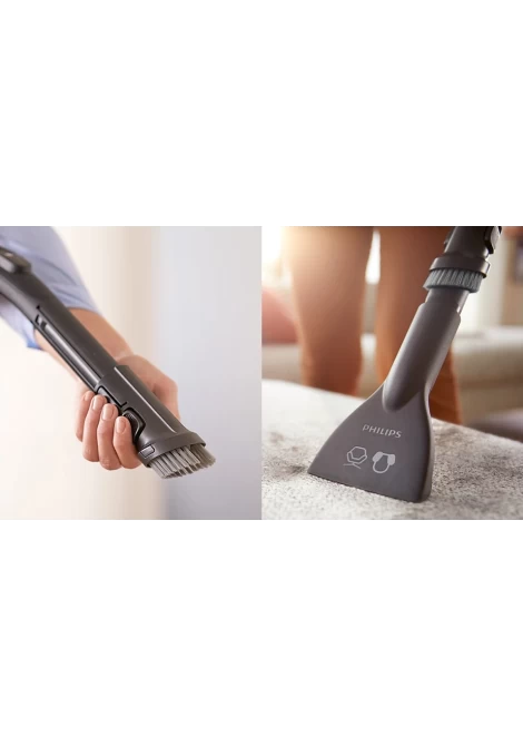 Η μαλακή βούρτσα είναι ενσωματωμένη στη λαβή, για να τη χρησιμοποιείτε σε έπιπλα, επίπεδες επιφάνειες και ταπετσαρίες. Το πέλμα επίπλων είναι σχεδιασμένο για τον καλύτερο καθαρισμό των μαλακών υφασμάτων επιπλώσεων, όπως μαξιλάρια και καναπέδες, και για την αποτελεσματική αφαίρεση των τριχών των κατοικίδιων.