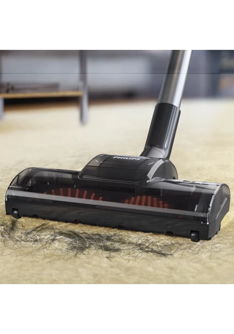 Η βούρτσα χαλιών SuperTurbo επιτρέπει τον βαθύ καθαρισμό των χαλιών, αφαιρώντας εύκολα τρίχες και χνούδια. Η περιστρεφόμενη βούρτσα που βρίσκεται στο εσωτερικό του πέλματος αφαιρεί ενεργά τα μικροσκοπικά μόρια σκόνης και τις τρίχες των κατοικιδίων, εξασφαλίζοντας καλύτερη απόδοση καθαρισμού.