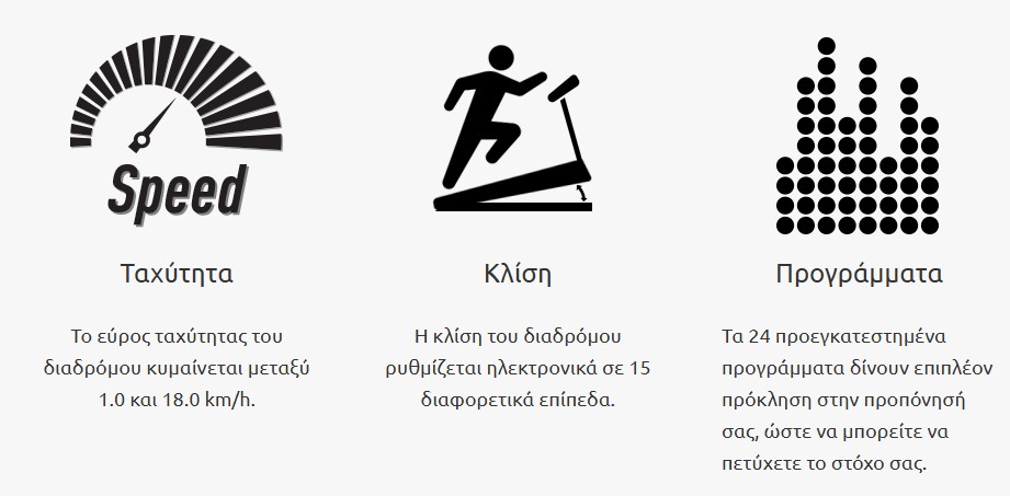 15 επίπεδα κλίσης, παρέχουν μία εξαιρετική επιλογή συνδυασμών για κάθε επίπεδο φυσικής κατάστασης. Για εκείνους που θέλουν απλώς να ανέβουν στο διάδρομο και να τρέξουν.